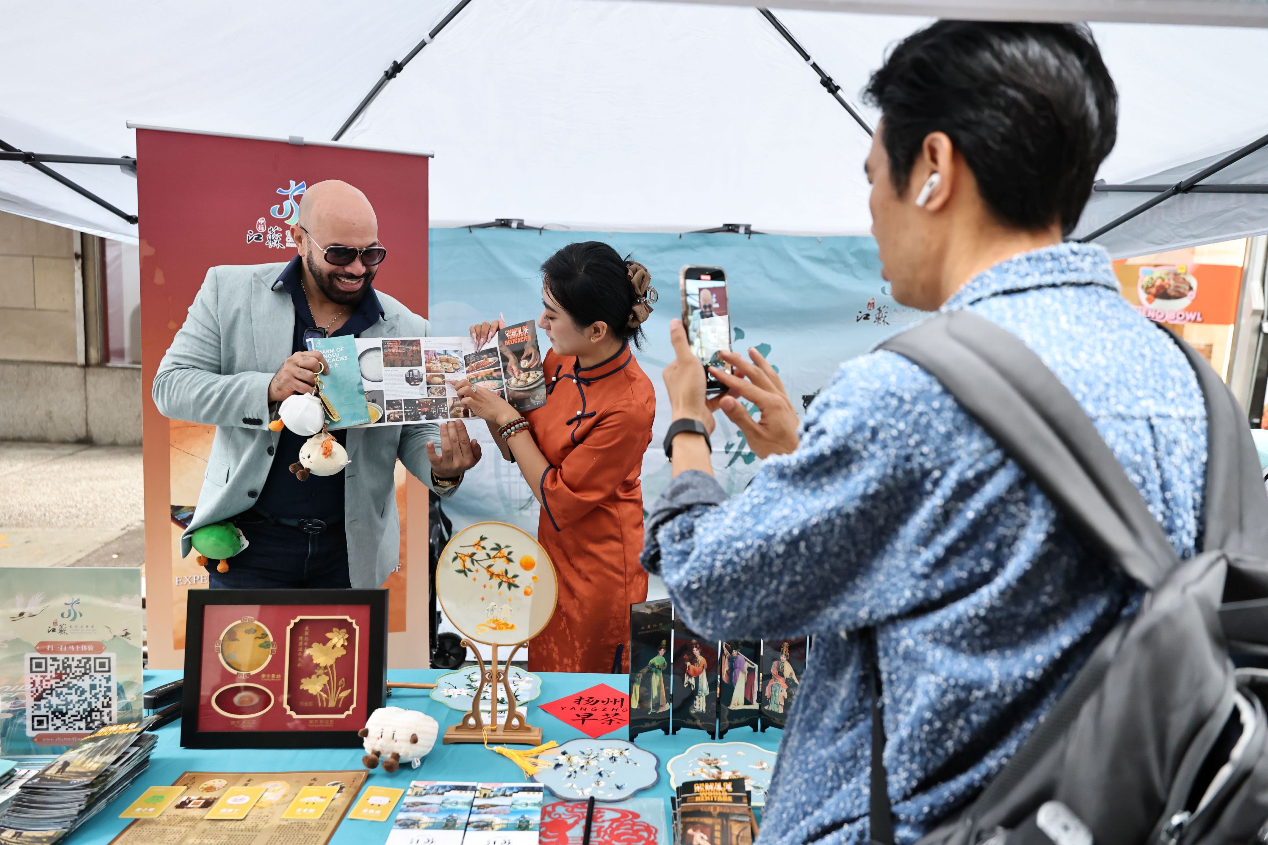 The Jiangsu booth drew a steady stream of attendees, with admiration and excitement filling the air. Social media influencer Alex Hermoso, who has nearly 400,000 followers, also stopped by and praised the exhibits: “These Yangzhou morning tea dolls are so cute, like carrying a piece of Yangzhou’s charm in my pocket!” and “This Suzhou embroidered fan is stunning!” From the playful Yangzhou tea dolls capturing Huaiyang’s lively spirit, to the elegant Mei Lanfang opera screen, to the shimmering Yunjin brocade, radiant gold-foil creations, and the exquisitely stitched Suzhou fans evoking the refined charm of Jiangnan — these cultural products represented innovative expressions of traditional craftsmanship while quietly showcasing the beauty of Jiangsu.