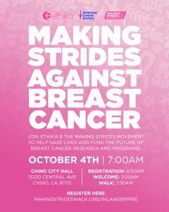 LAKE FOREST, CA, UNITED STATES, October 3, 2025 /EINPresswire.com/ -- Ethika is proud to stand shoulder-to-shoulder with the American Cancer Society (ACS) as the official “Hope and Familie Partner” for this year’s Making Strides Against Breast Cancer walk. On Saturday, October 4th, at 7:00 AM, the Chino community will gather at Chino City Hall, 13220 Central Ave, Chino, CA 91710, to walk in unity, raise awareness, and fuel hope for survivors and families everywhere.