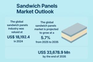 WILMINGTON, DE, UNITED STATES, October 8, 2025 /EINPresswire.com/ -- The global sandwich panels market has emerged as a crucial segment within the construction and insulation materials industry, owing to the increasing demand for durable, energy-efficient, and lightweight building solutions. In 2024, the global industry was valued at US$ 18,192.4 Mn, and it is projected to grow at a CAGR of 5.7% from 2025 to 2035, reaching a value of US$ 33,678.9 Mn by the end of the forecast period.