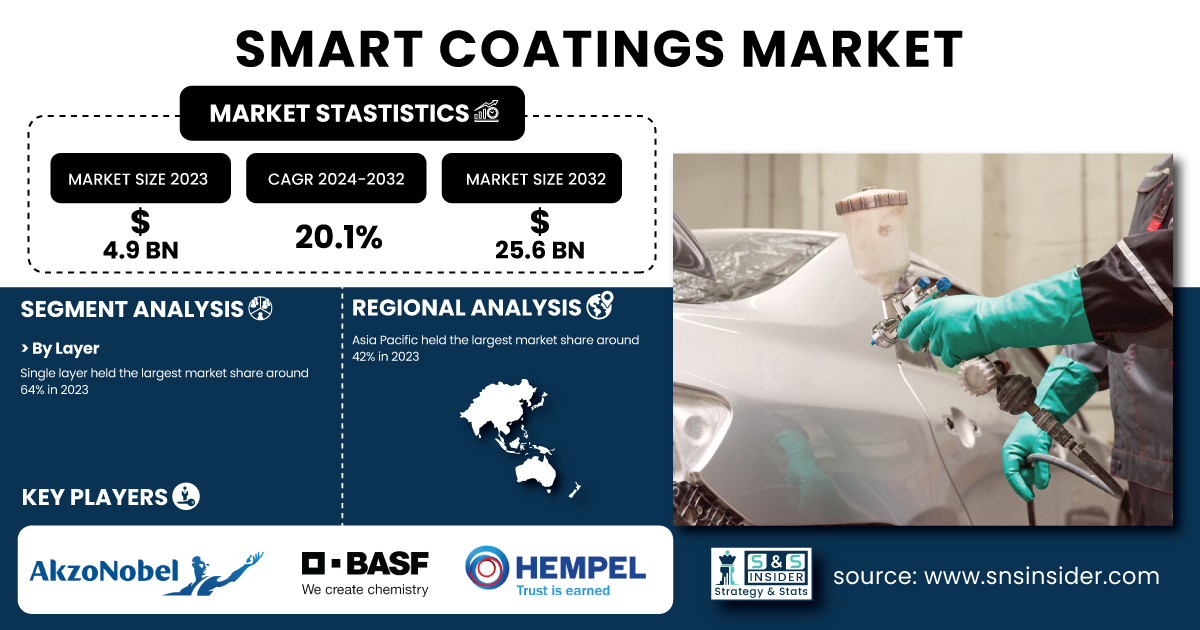 AUSTIN, TX, UNITED STATES, February 24, 2025 /EINPresswire.com/ -- The smart coatings market was valued at USD 4.9 billion in 2023 and is projected to reach USD 25.6 billion by 2032, growing at a CAGR of 20.01% from 2024 to 2032. Growing adoption in the automotive, aerospace, construction, healthcare, and consumer electronics sectors is driving rapid market expansion. Increasing demand for smart coatings due to corrosion protection, self-healing properties, and government regulations is expected to drive the market growth of smart coatings. The development of new technologies, like nanotechnology, stimuli-response coating, and AI-driven formulation methods, continues to enhance the efficiency, functionality, and cost-effective ability of smart coatings. To improve their product offerings, industry leaders are investing in research and development to develop products with increased efficiency and sustainability, incorporating innovative components such as artificial intelligence and eco-friendly raw materials.Get a Sample Report of Smart Coatings Market @ https://www.snsinsider.com/sample-request/5596